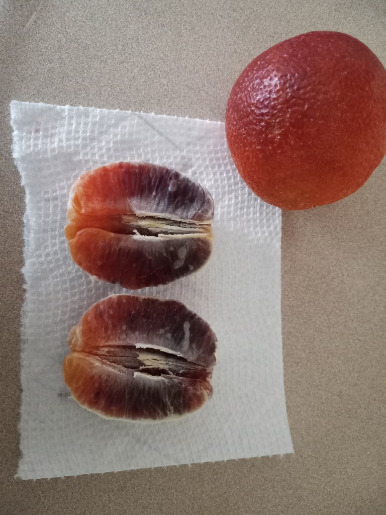 Blood oranges– the first time I had one it was freshly grown from a tree in someone’s yard and it was delicious, so I get them from a grocery store now and think they might be my favorite. They don’t look great, there is an uneven gradient discoloration to the peel and fruit both, but they’re good to eat, here’s a photo of one I had recently
