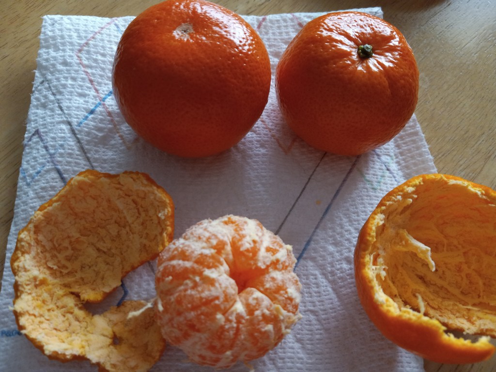 Clementine– very nice but I think they’re too small, so I have to eat several. They are very easy to peel so it’s not a hardship, just slightly annoying. I highly recommend a napkin or paper towel to go along with any citrus snack it’s great for wiping sticky juice and collecting all the pieces of rind and fibers