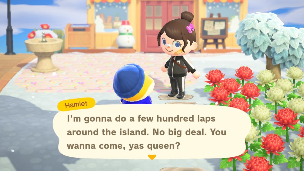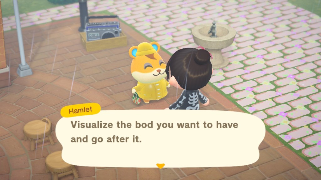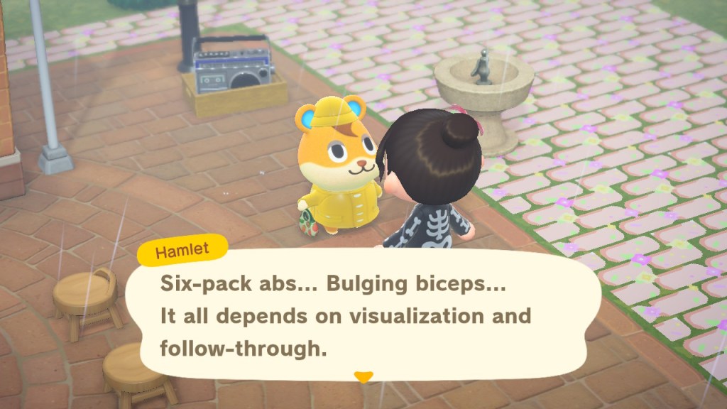 Trigger warning, I am writing about the topic body image, weight loss and fitness, also bullying. The video game Animal Crossing New Horizons that I’ve been playing for about 6 months did not come with such a warning! It’s a cute dollhouse kind of game where your neighbors in the village can have different personality types. They are clothed and upright anthropomorphic creatures like a horse, sheep, bird, etc. Their programming and lore has them behave with overall traits like: sisterly, peppy, snooty, smug. It isn’t mandatory to interact with them, but there are obvious rewards when you do. One of the characters on my digital island since day one, is a “jock” type. He is a small yellow hamster called Hamlet. I’ve been worried about him or else become triggered pretty frequently from our interactions (for me this means anxious, self conscious, the urge to self-harm or relapse into starvation/purging, that sort of thing).
