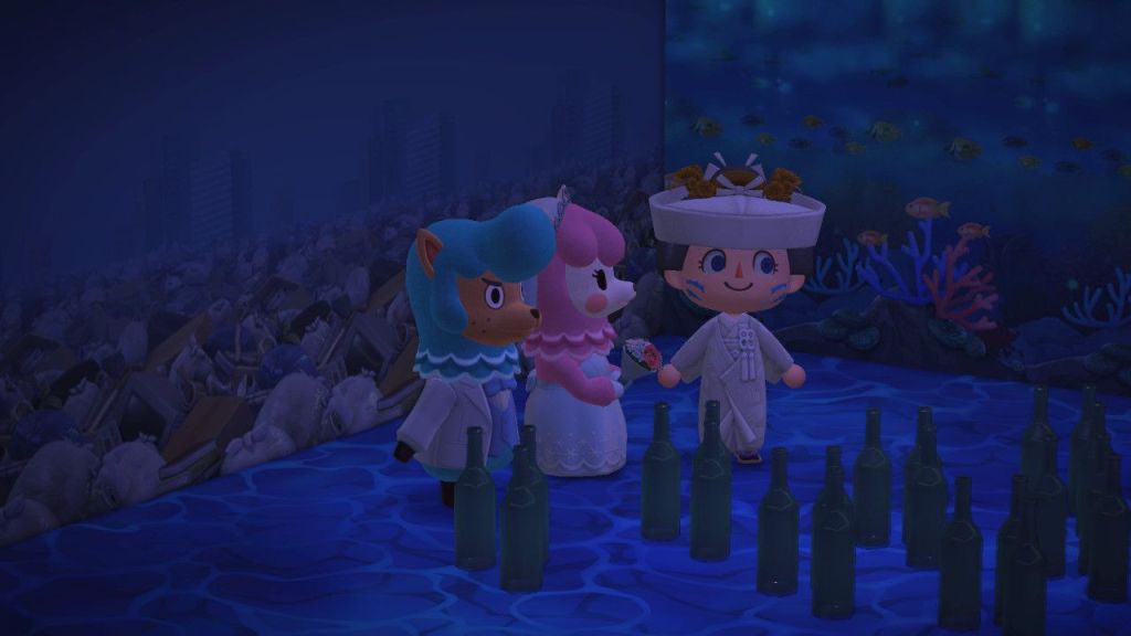 There is an annoying couple in ANCH (a videogame I have played for over 1000 hours, wow) who continuously celebrate their love for eachother every day through June. They are a pair of alpacas and want wedding themed anniversary photos taken. Sometimes they ask to recreate their own nuptial ceremony or re-imagine it in a distinctly different style. They might ask to have a reception party photographed with decorations of a specific color palette, or a particular variety of props, each day more demands. It’s not my favorite aspect of the video game, and is easy to avoid, but I’ve been playing with them more this year.There are rewards when you do a photoshoot, and cute items that become unlocked. I’ve been having fun wearing strange outfits and experimenting using more negative emotional reactions toward them, and generally ruining their sentimental pictures.