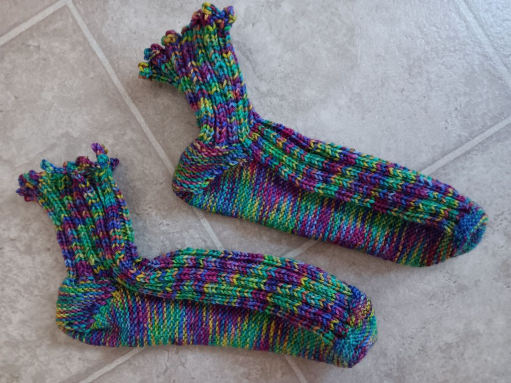 These rainbow socks are done and soon it will be cool enough weather to wear them. I didn’t use a pattern, it was freestyle knit, off the dome, and I am very happy with the fit. The socks are mainly ribbed, with a “princess sole” that’s very soft and smooth compared to other sock construction techniques. I’m definitely going to recreate these again when I buy more sock yarn.