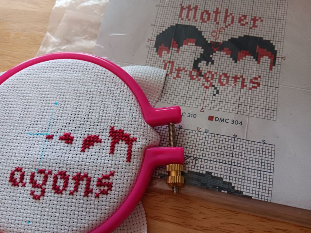 It was an impulse purchase I got for about $6 at a discount department store (TJ Maxx). I don’t have lots of experience with cross stitch, but enjoyed the few cheap kits I picked up over the years, and this is a fun one, too. It’s nice to have a change of pace and try a different form of craft sometimes. There are 5 small patterns/designs included, which seems generous. I used to watch Game of Thrones and remember it fondly, though I haven’t rewatched since it ended. The dragon image was my first choice to start stitching, I haven’t gotten very far, but it seems to be going ok for me. The letter “g” has some mistakes, but I’m just going to ignore that and continue